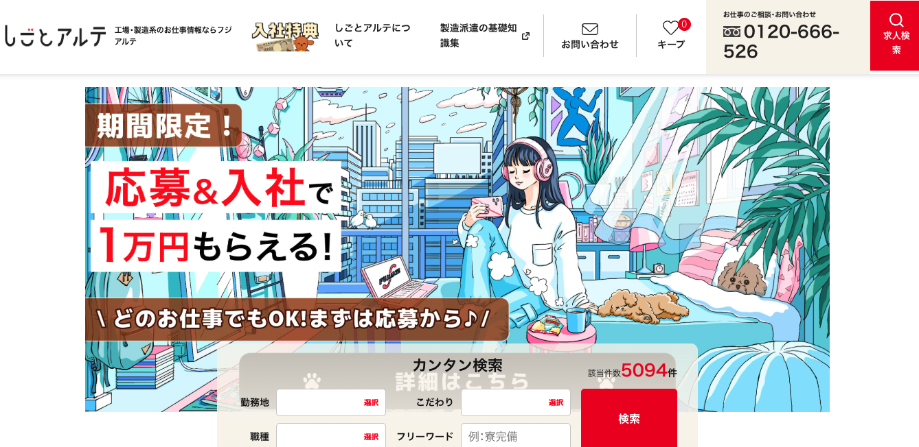 しごとアルテは、全国の製造・工場系の仕事探しに特化した求人サービスで、「寮付きで働きたい」「未経験から製造業に挑戦したい」「高収入の仕事を探したい」という方にとても相性の良い求人サイトです。