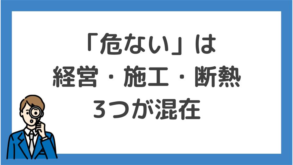 以上のように、「危ない」の裏には経営・施工・断熱の3つの不安が混在していますが、経営は根拠のない噂です。